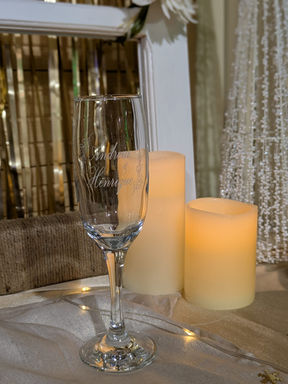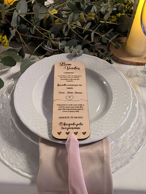 Desenvolve convites personalizados, menus de mesa, marcadores de lugar para convidados, molduras com o nome das mesas, placas decorativas, porta-alianças, copos de champanhe personalizados com os nomes dos noivos e lembranças únicas, criadas para refletir a identidade e o estilo de cada casal.