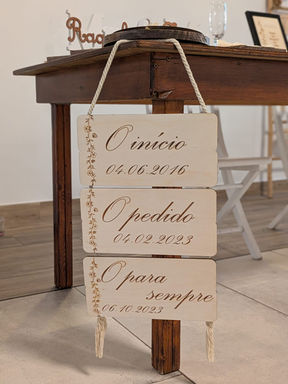 Desde topos de bolo e placas de boas-vindas até lembranças personalizadas e detalhes decorativos, cada criação é desenvolvida com cuidado, dedicação e muito amor. Trabalha lado a lado com os noivos para transformar ideias, nomes e datas em peças que perduram no tempo — não apenas no dia do casamento, mas também na memória.
